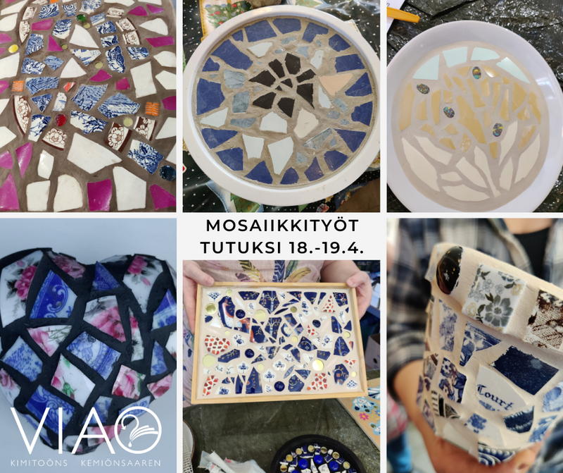 Mosaiikkitöiden teko on yllättävän helppoa ja todella hauskaa. Tule löytämään sisäinen taiteilijasi! Materiaalikustannukset noin 15 €/osallistuja maksetaan suoraan kurssiohjaajalle.
